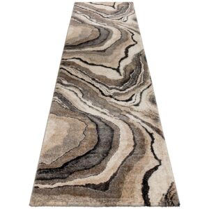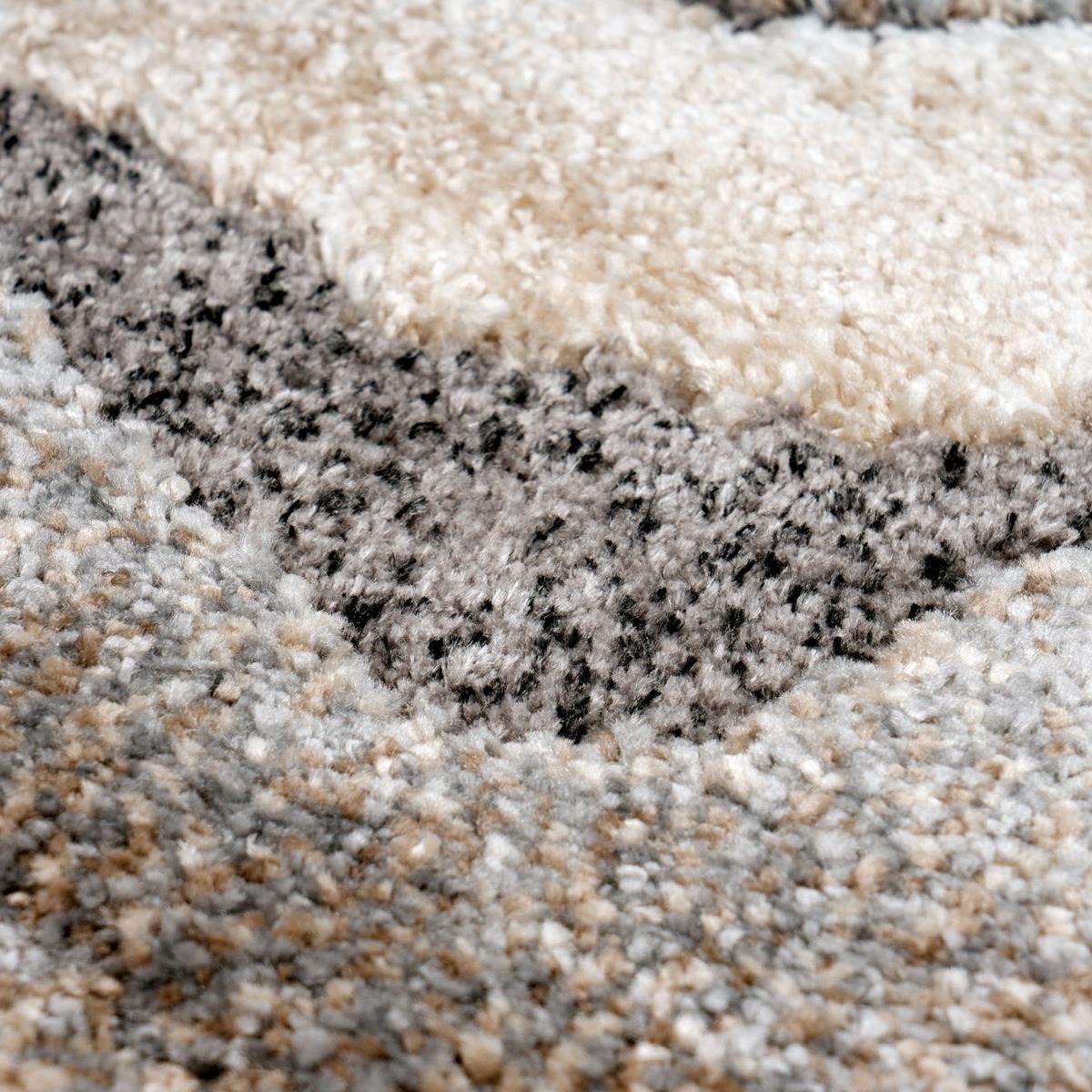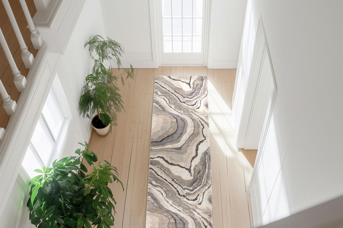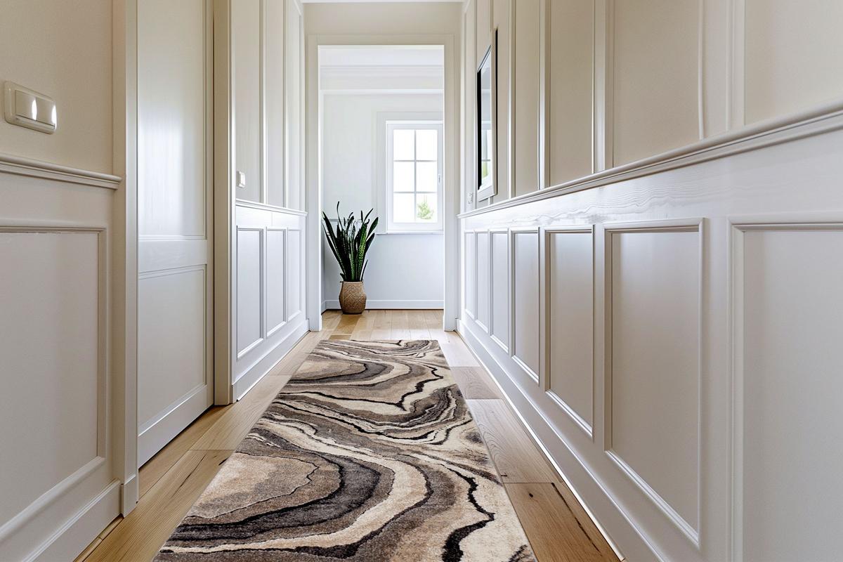 Charakterystyczną cechą tego modelu jest układ warstw przypominających strukturę kamieni i minerałów. Falujące, nieregularne linie tworzą efekt wizualnej głębi, którą podkreśla zróżnicowana paleta odcieni – od jasnych beży, przez szarości, aż po grafitowe akcenty. Całość została zaprojektowana tak, by nadać wnętrzu nowoczesności, jednocześnie zachowując subtelne, stonowane wykończenie, które łatwo dopasować do wielu stylów.