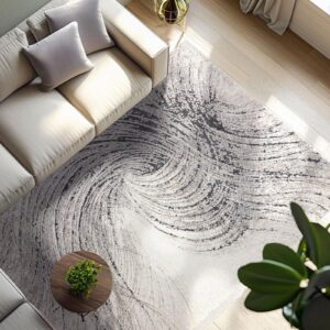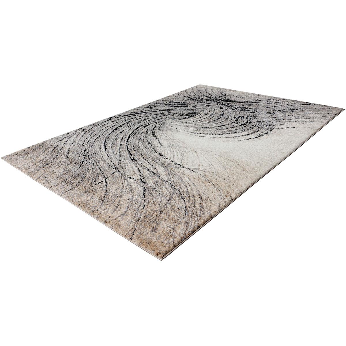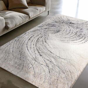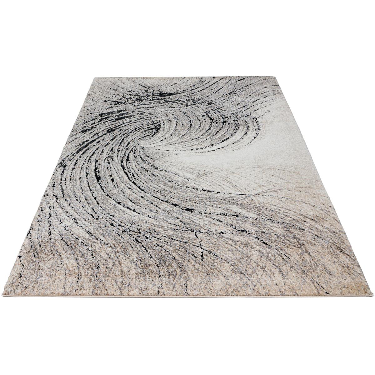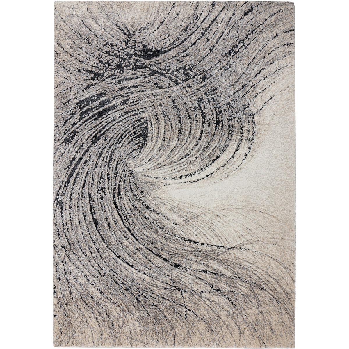 Najbardziej wyróżniającym elementem tego dywanu jest jego efektowny motyw wirujących linii układających się w kierunkowe, płynne formy. Spiralne pasma przechodzą od jasnych kremów i beżów po chłodniejsze odcienie szarości, tworząc harmonijną, a jednocześnie wyrazistą kompozycję. Taka stylistyka świetnie sprawdza się we wnętrzach, które potrzebują dekoracyjnego urozmaicenia bez nadmiernego obciążenia przestrzeni.