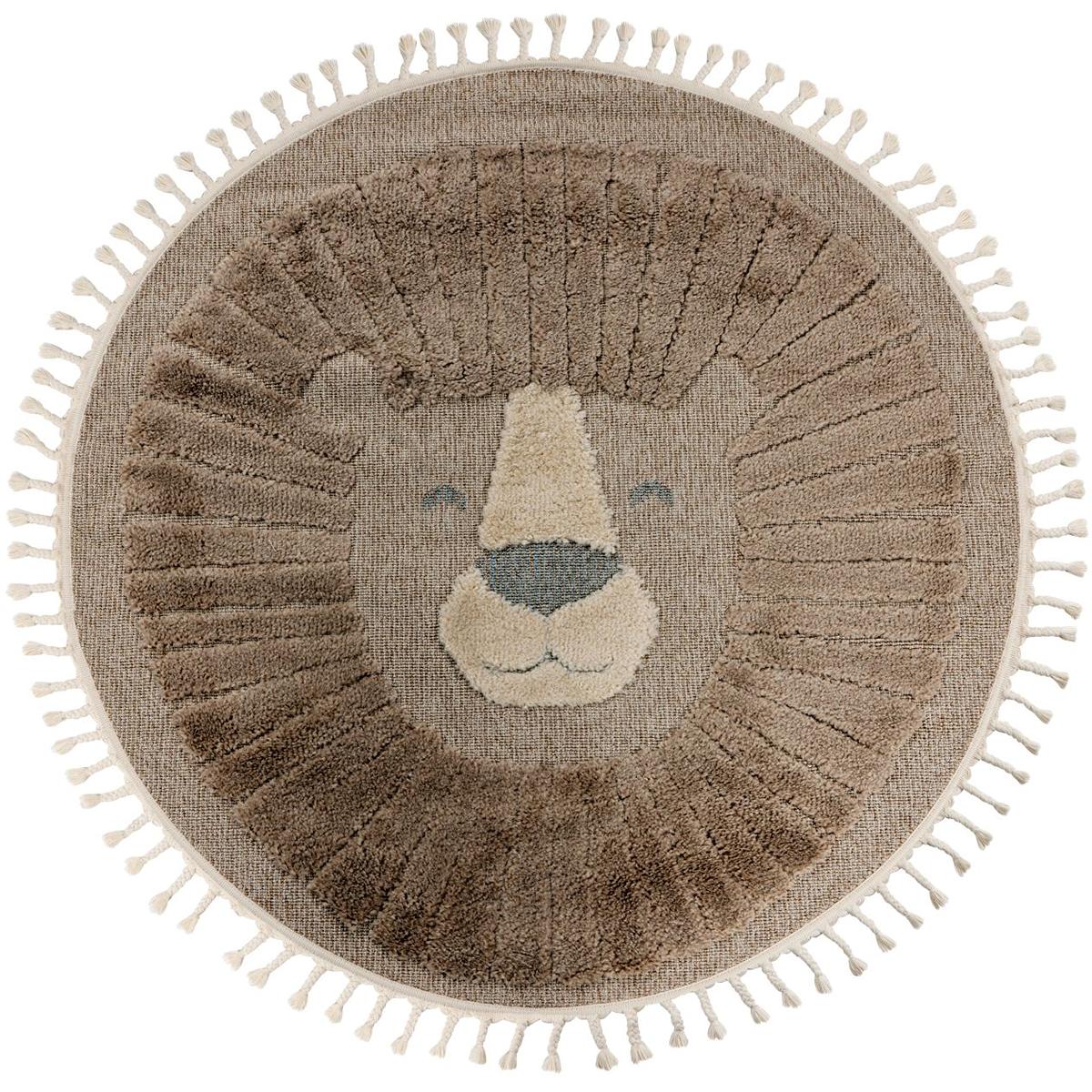 Centralnym elementem tego projektu jest uroczy lew o pogodnym wyrazie twarzy. Wzór został wykonany techniką Cut & Loop, dzięki czemu grzywa zyskała trójwymiarową, miękką strukturę. To właśnie ona nadaje dywanowi wyjątkowego charakteru – subtelny efekt 3D sprawia, że wzór jest bardziej wyrazisty, przytulny i interesujący dla dziecka. Naturalna paleta kolorów – beże, brązy i delikatne akcenty – tworzy harmonijną kompozycję, która pasuje do wielu stylistyk wnętrz.