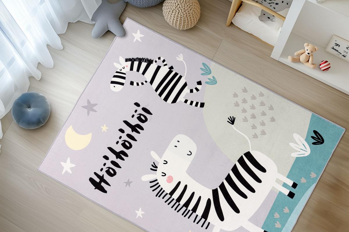 Grafika przedstawiona na dywanie nawiązuje do świata zwierząt w bardzo przyjaznej, dziecięcej formie. Zebry mają uproszczone kształty, łagodne linie i pogodny wyraz, co sprawia, że wzór jest miły w odbiorze i budzi pozytywne skojarzenia. Motywy gwiazd i księżyca dodatkowo wprowadzają element baśniowej narracji, idealnej do wieczornego wyciszenia.